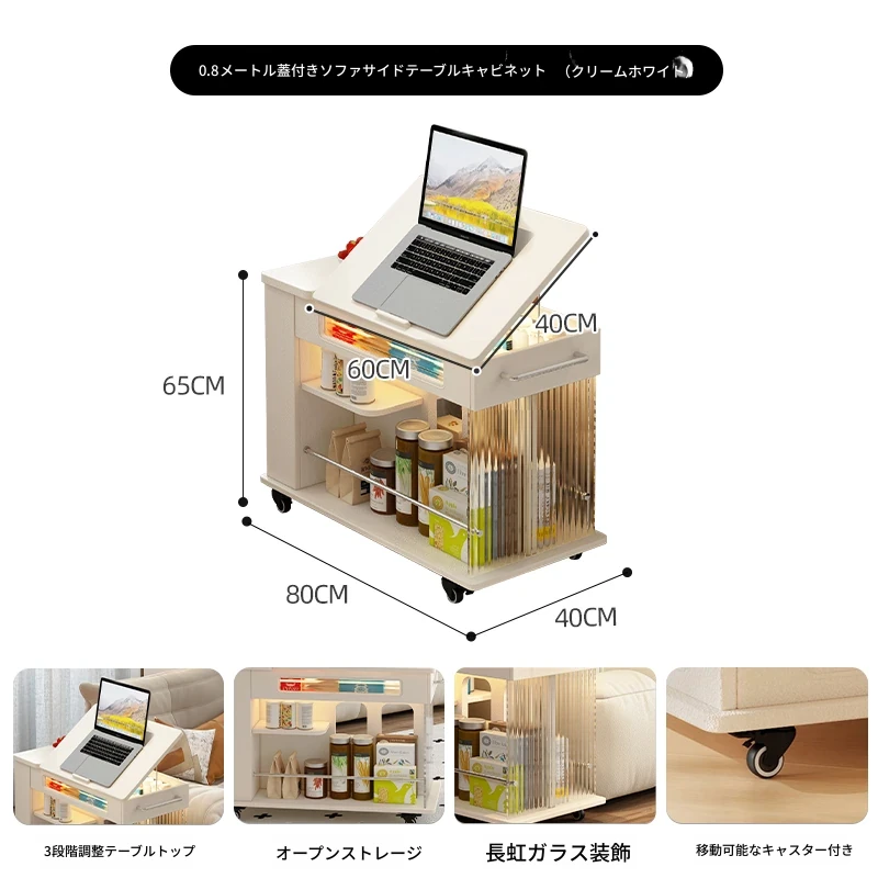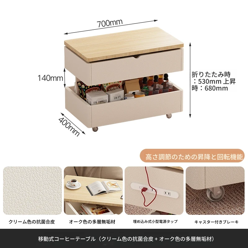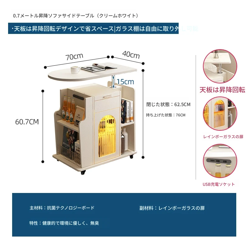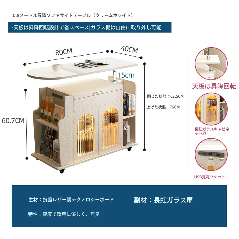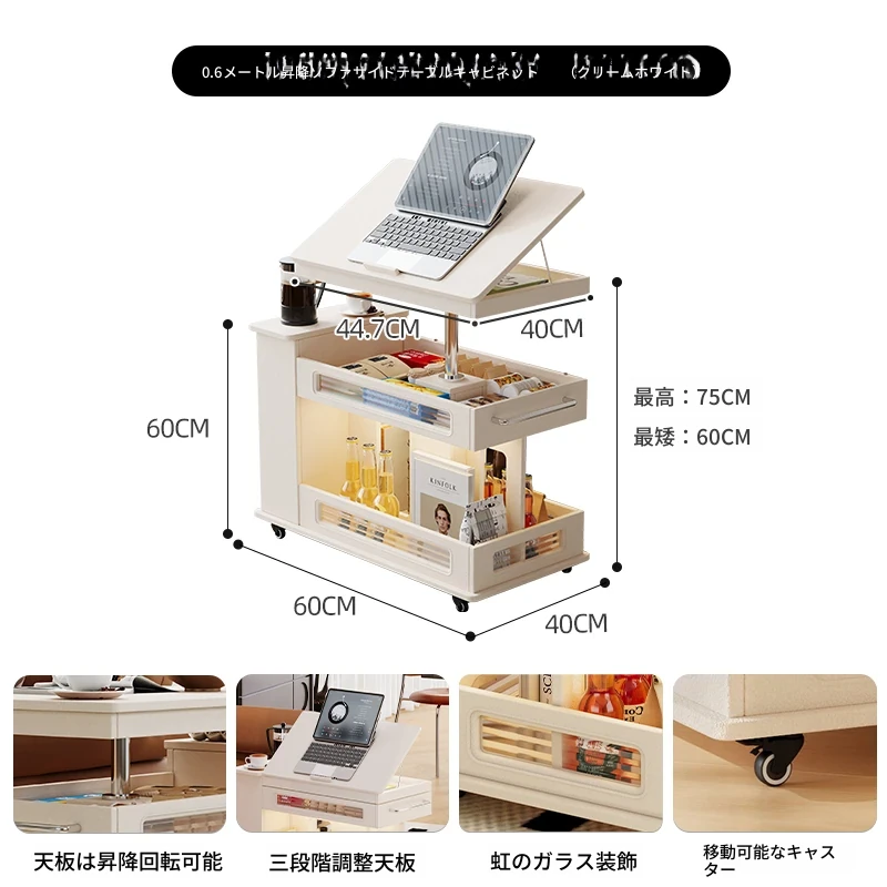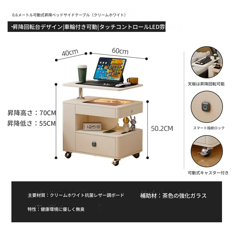 60cm 多機能昇降サイドテーブル【クリームホワイト肌感皮革 + 昇降回転テーブル天板 + キャスター + USB充電 + LEDライト + 指紋ロック】