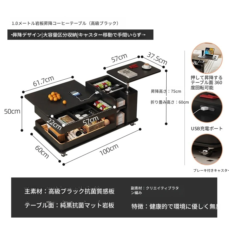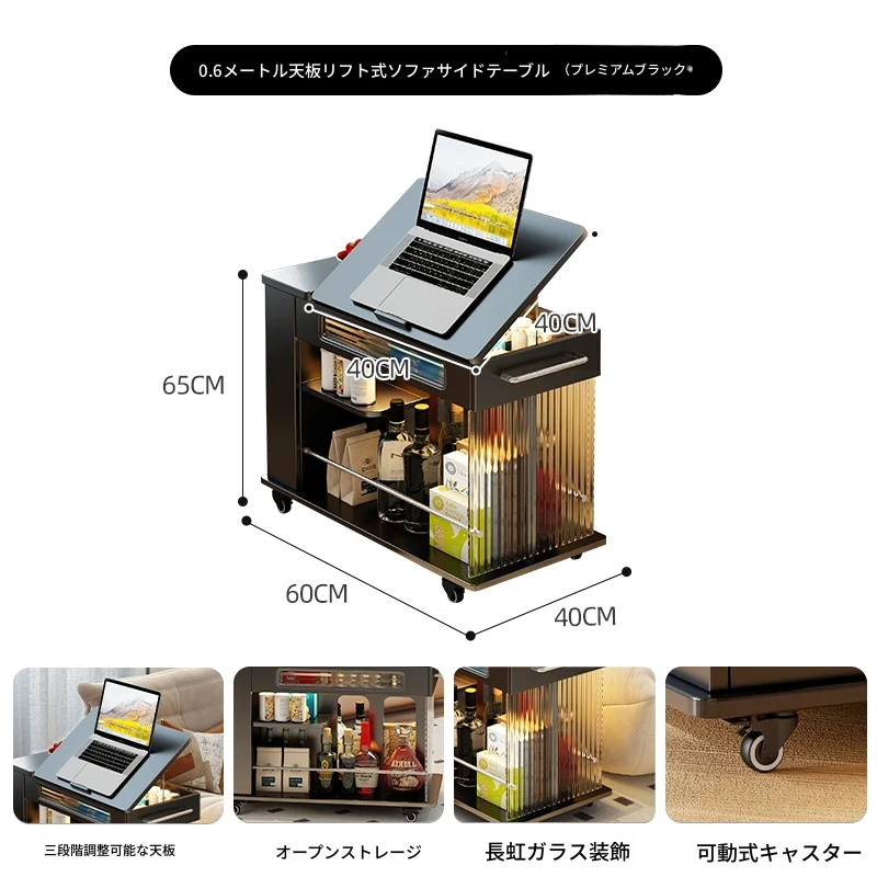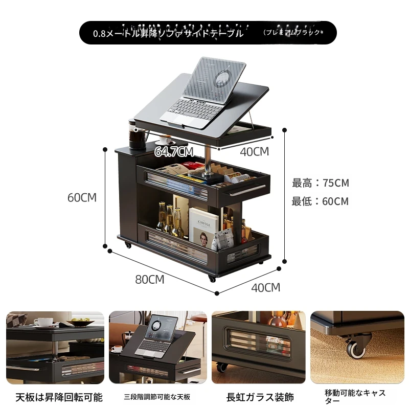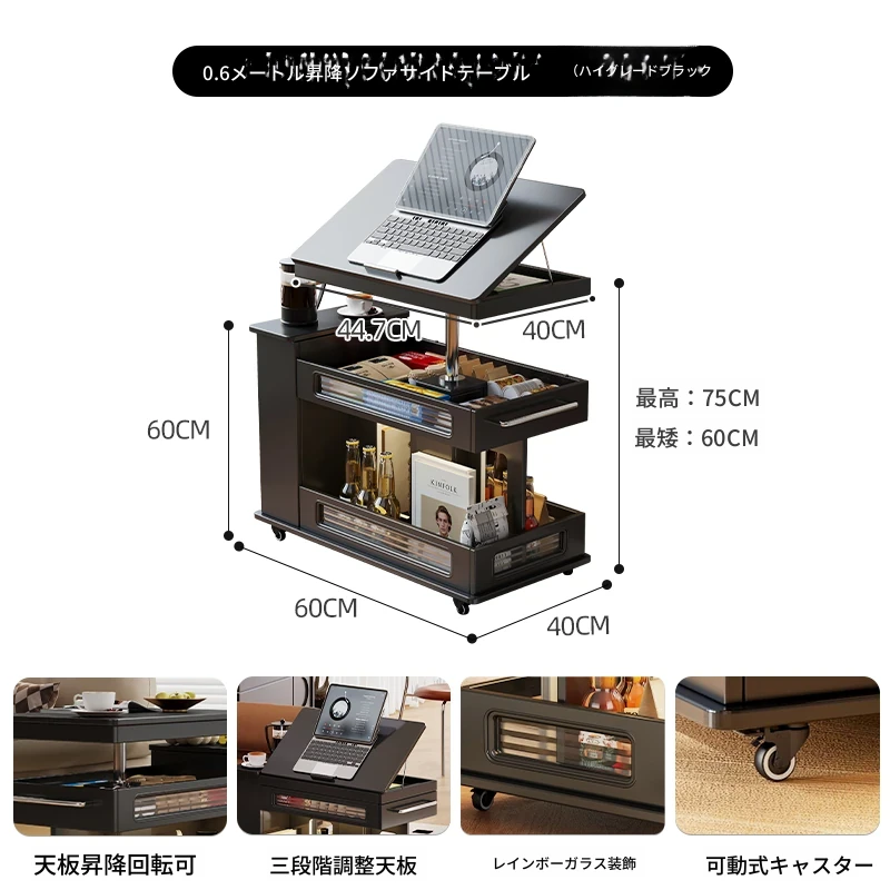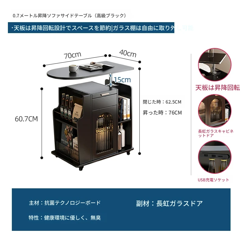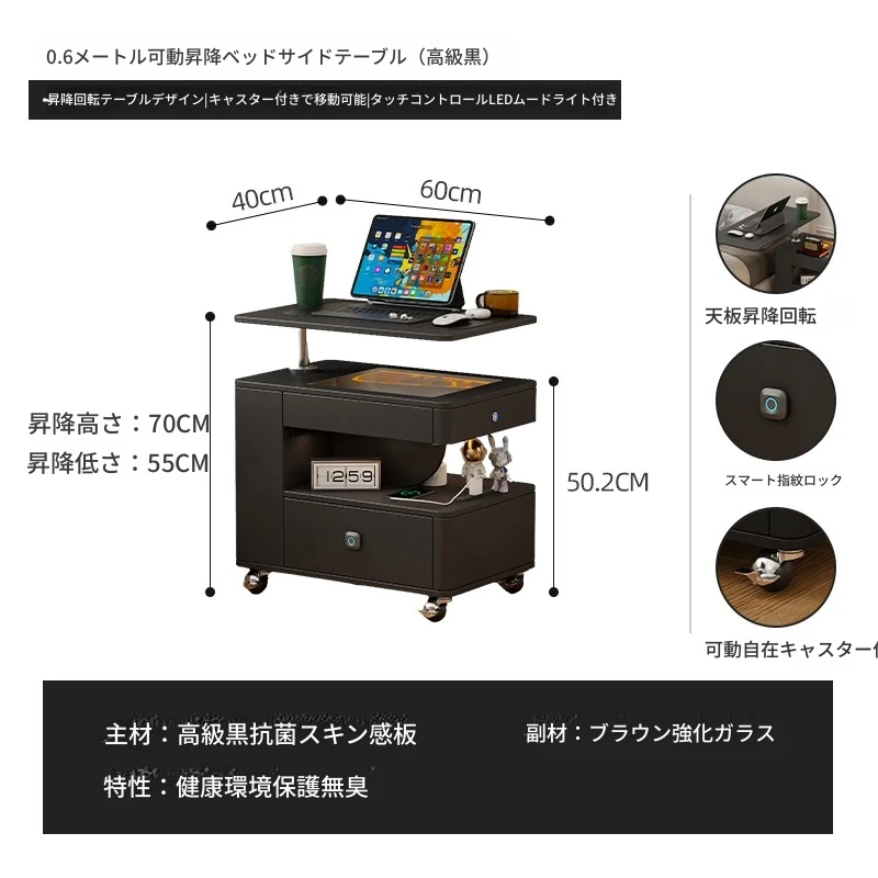60cm 多機能昇降サイドテーブル【黒色抗菌エコボード + 昇降回転テーブル天板 + キャスター + USB充電 + LEDライト + 指紋ロック】