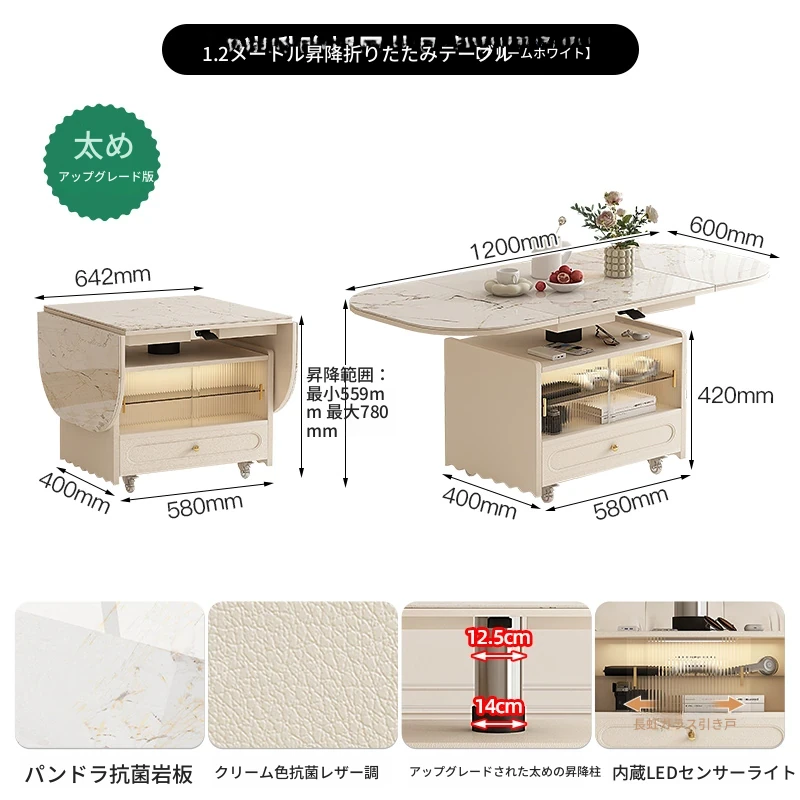 1.2メートル 移動式昇降折りたたみ テーブル【5防菌肌感】 回転昇降テーブル天板