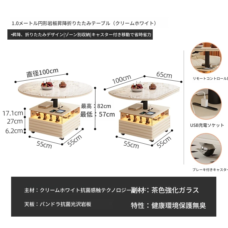 1.0メートル 多機能昇降四角いティーテーブル【5防菌肌感】
