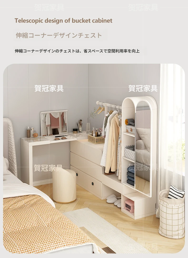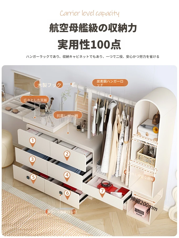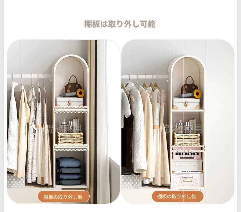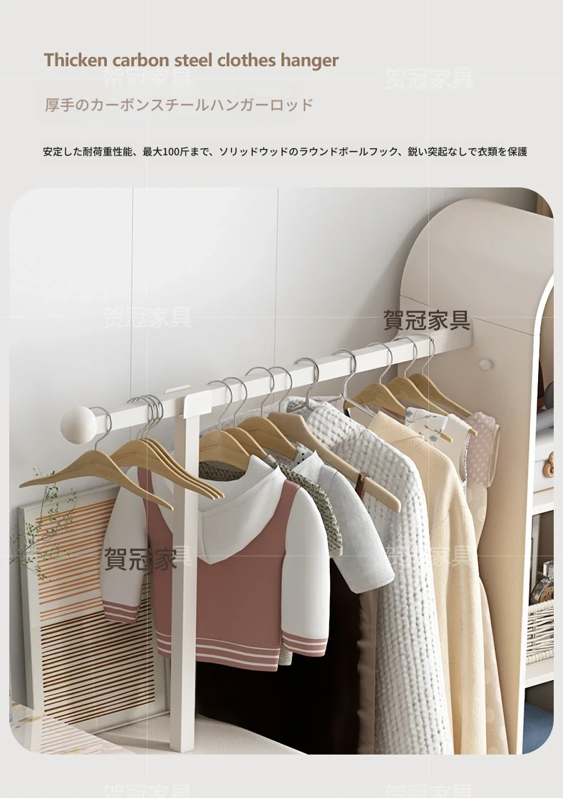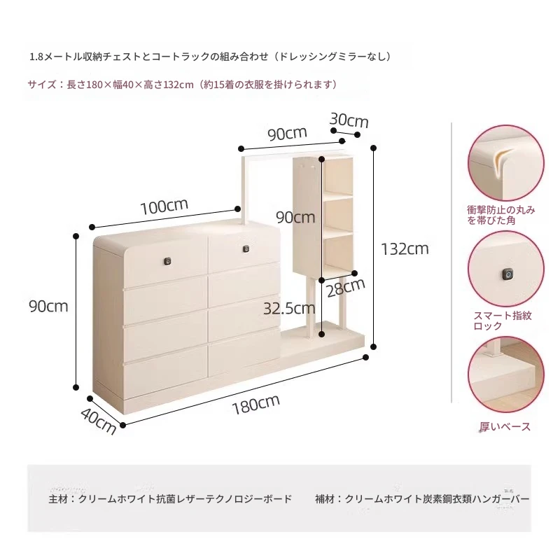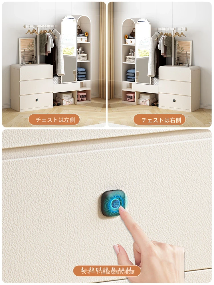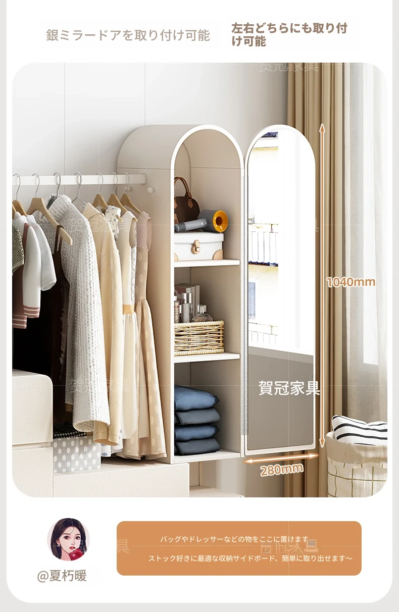 省スペースで優雅なフレンチクリームスタイル!ミラー付き靴&衣類収納ハンガー一体型コーナーラック