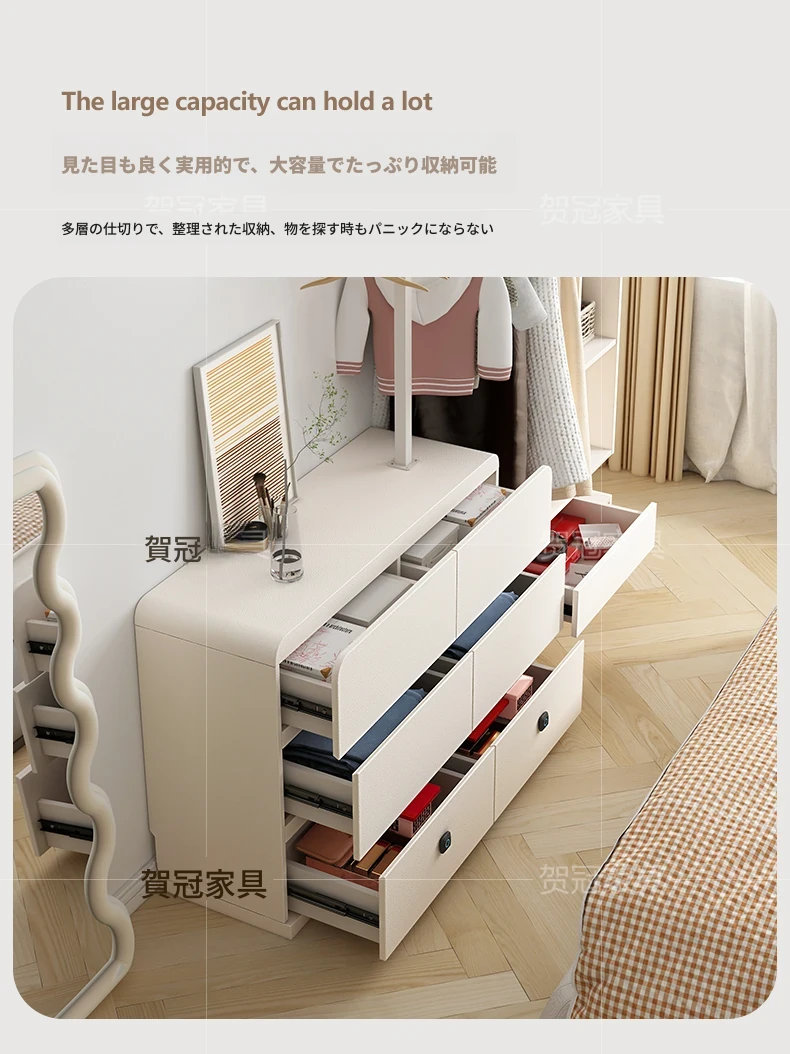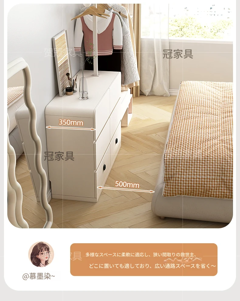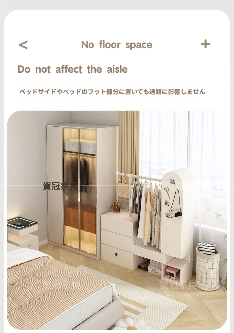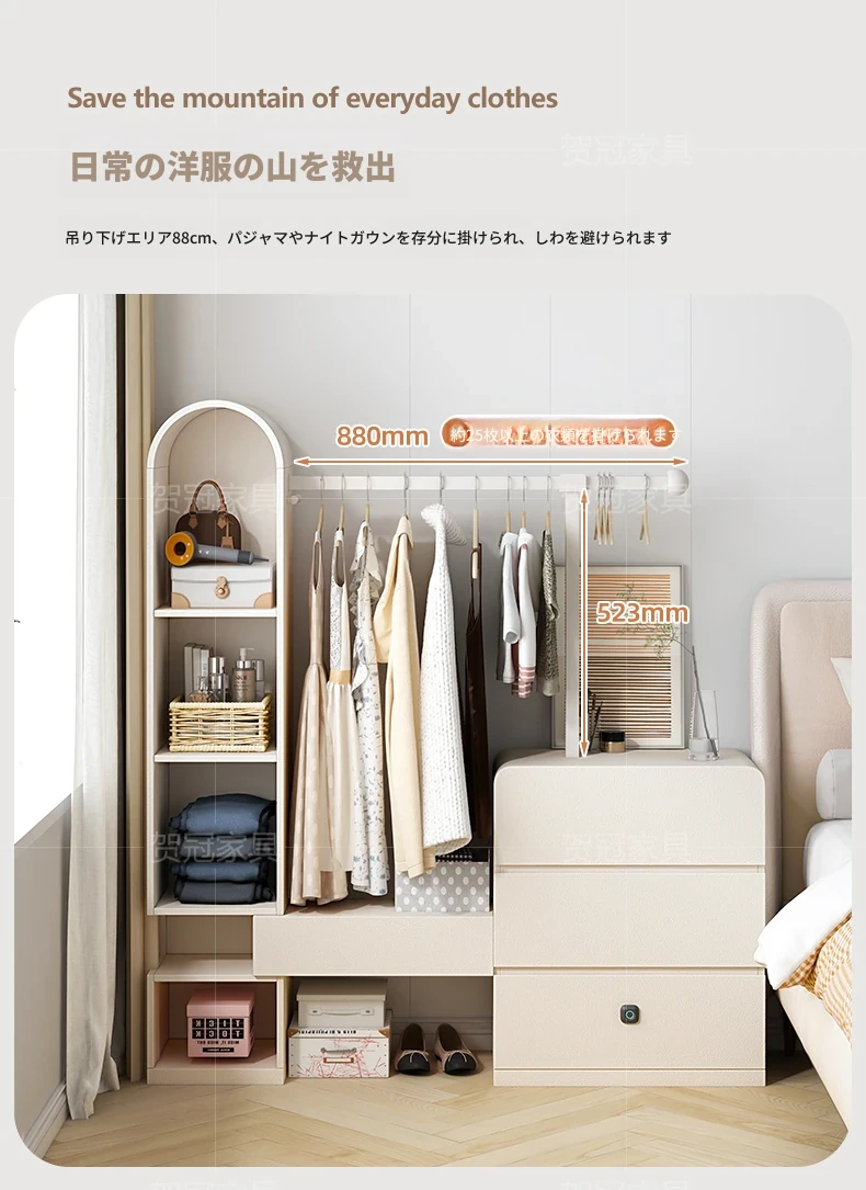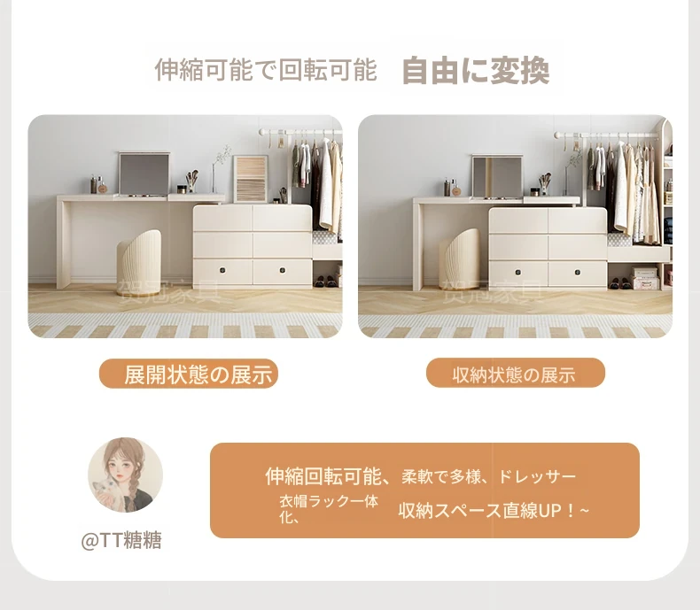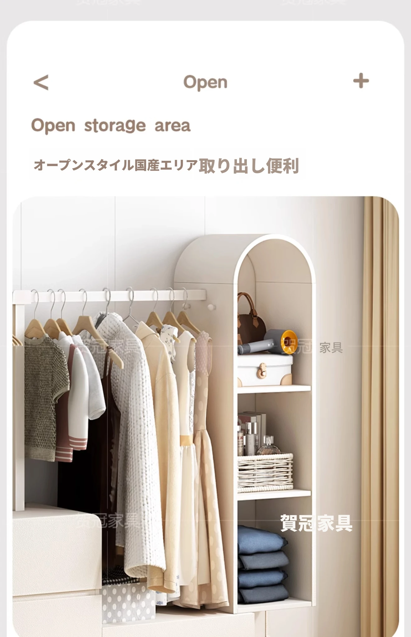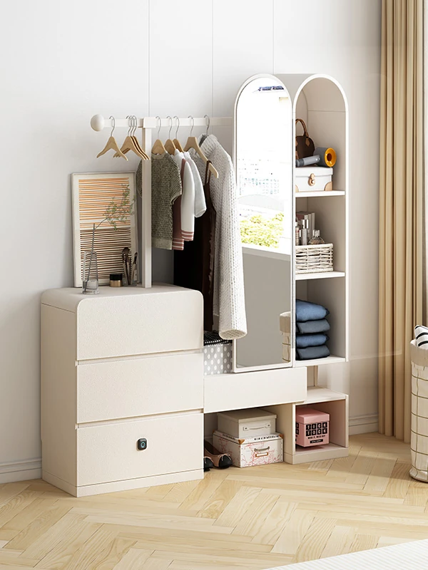 省スペースで優雅なフレンチクリームスタイル!ミラー付き靴&衣類収納ハンガー一体型コーナーラック