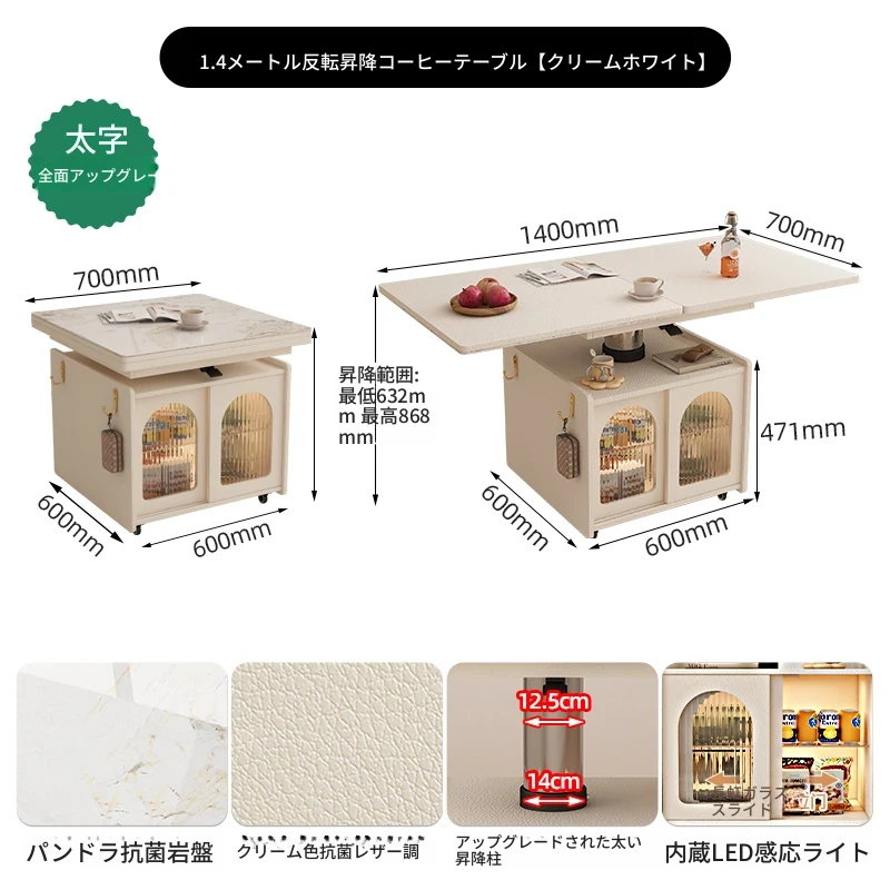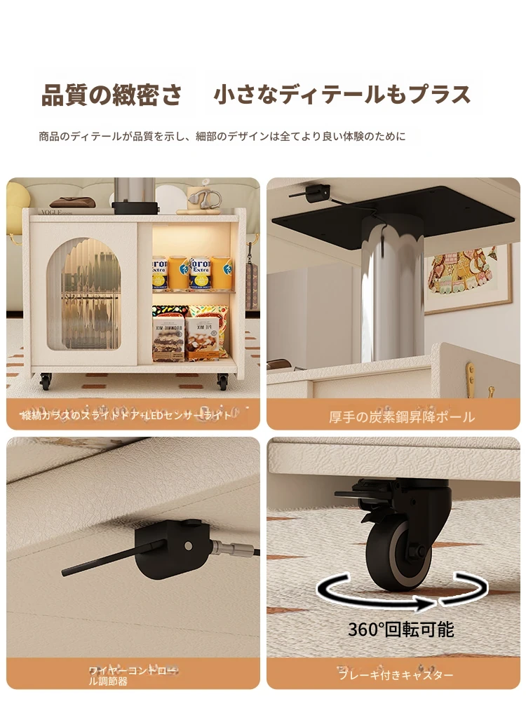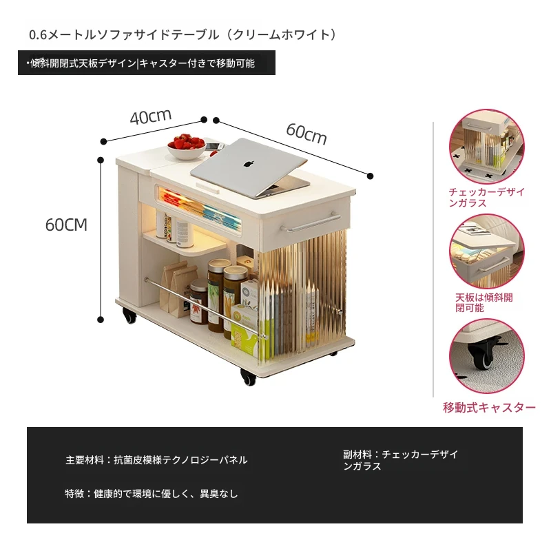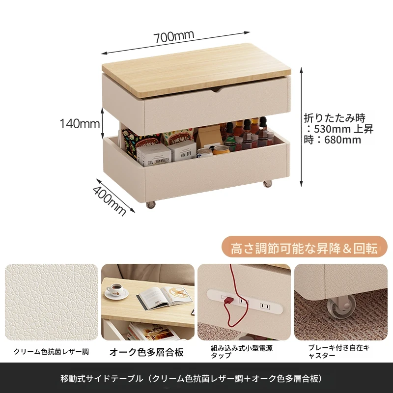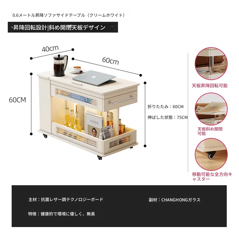 60cm多機能昇降サイドテーブル【クリームホワイト肌触りレザー模様+昇降回転テーブルトップ+キャスター+USB充電+ライトストリップ+指紋ロック】