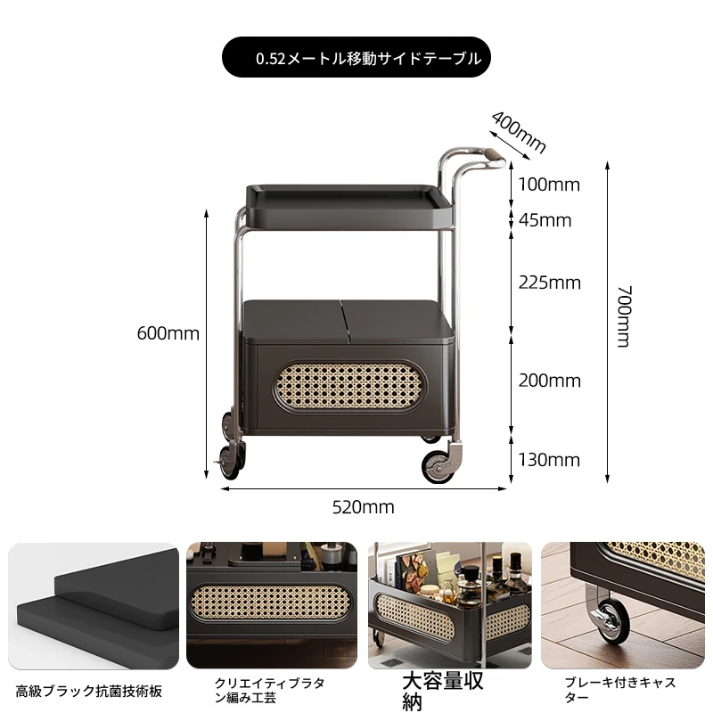 0.5メートル籐編み小型カートサイドテーブル【ビンテージブラック】