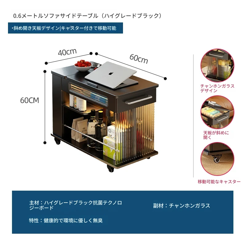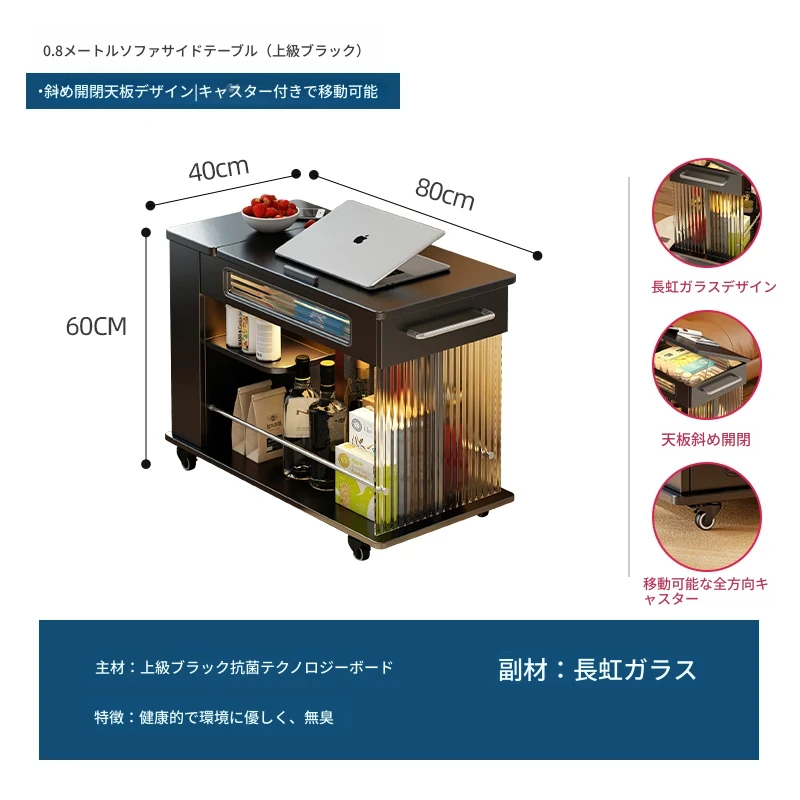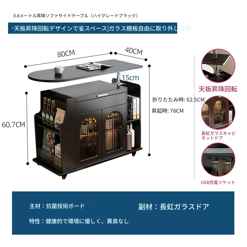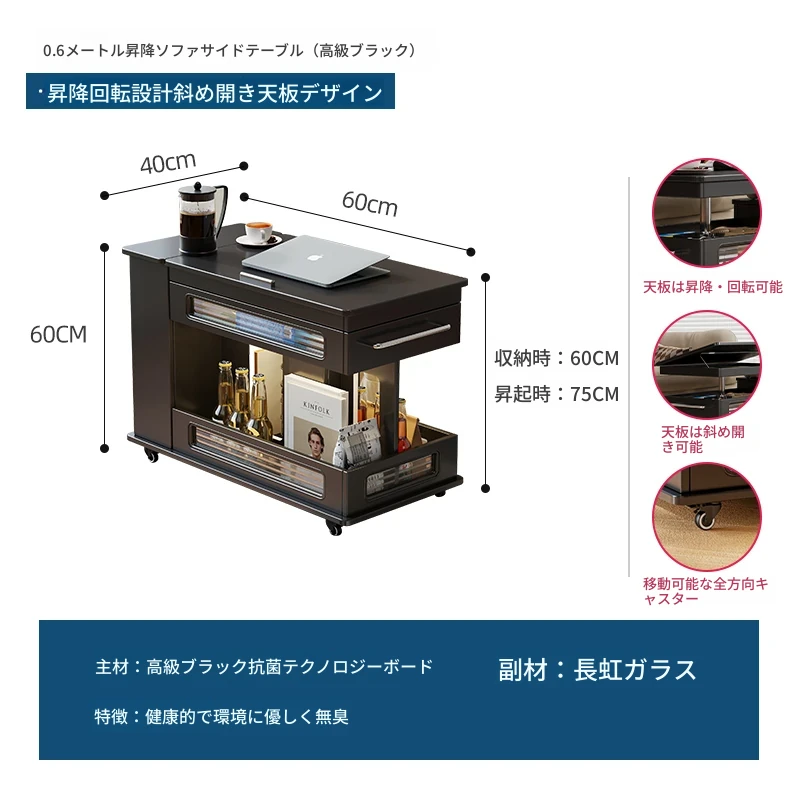 60cm多機能昇降サイドテーブル【ブラック抗菌エコボード+昇降回転テーブルトップ+キャスター+USB充電+ライトストリップ+指紋ロック】