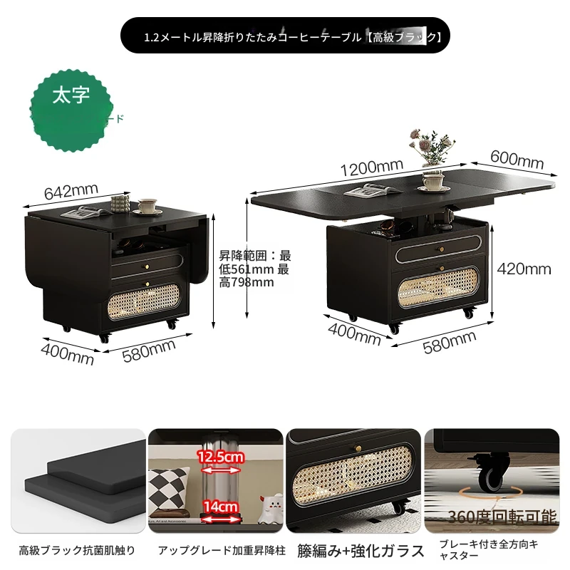 1.2メートル移動可能昇降折りたたみティーテーブルダイニングテーブル【高級ブラック】 回転昇降テーブルトップ