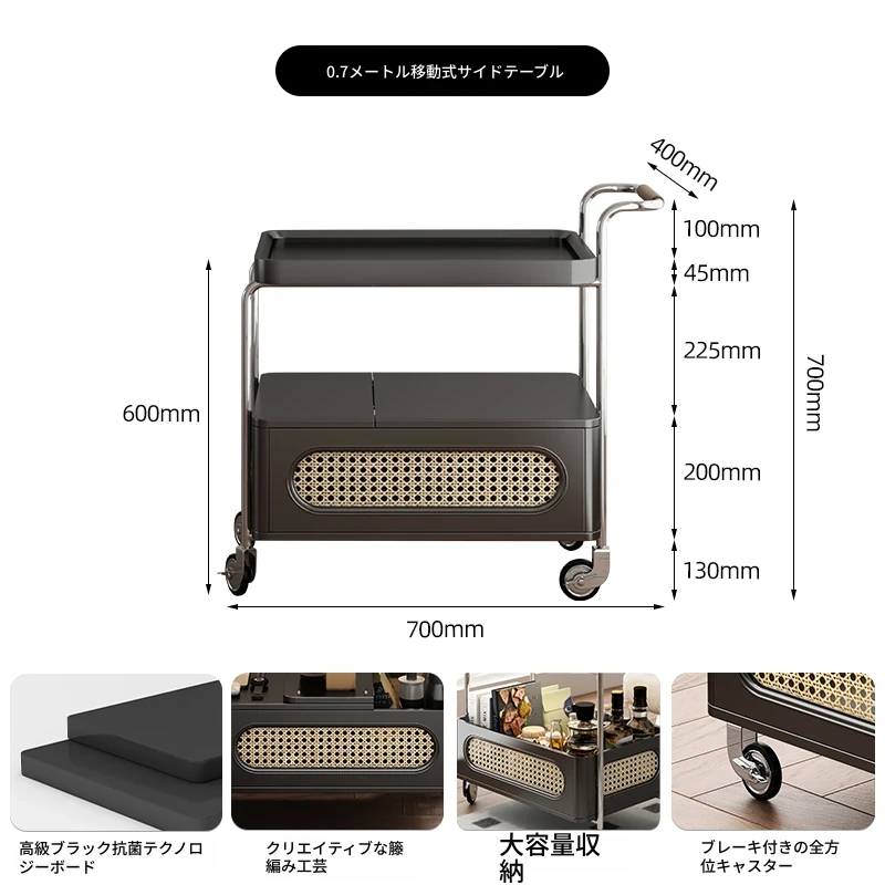 0.7メートル籐編み小型カートサイドテーブル【ビンテージブラック】