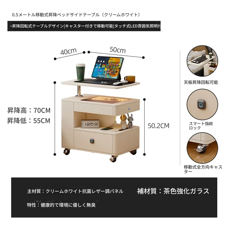 50cm多機能昇降サイドテーブル【クリームホワイト肌触りレザー模様+昇降回転テーブルトップ+キャスター+USB充電+ライトストリップ+指紋ロック】