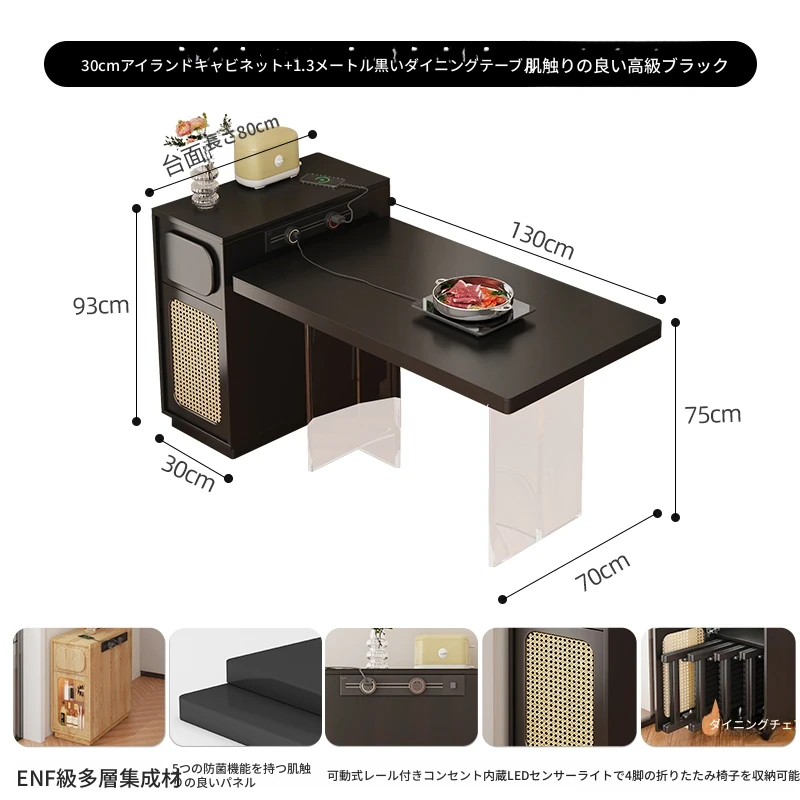 0.3メートルの狭い島台キャビネット+1.3メートルアクリルテーブル【折りたたみ椅子4脚収納可+抗菌岩板天板+五つの防菌高級ブラック】