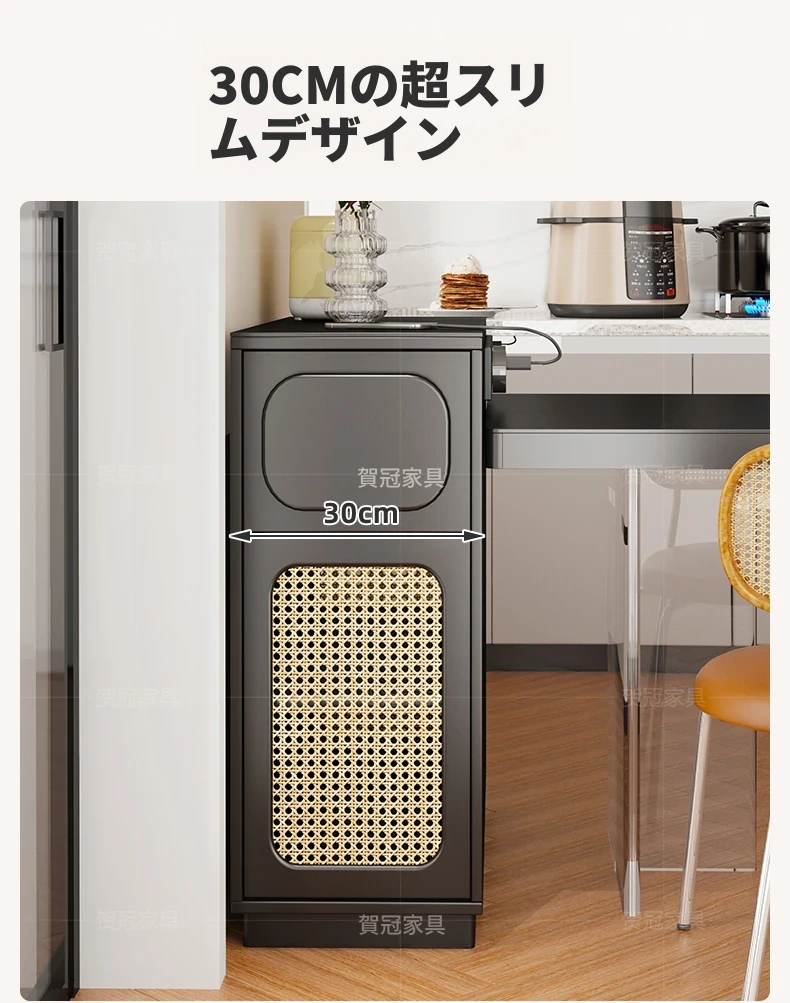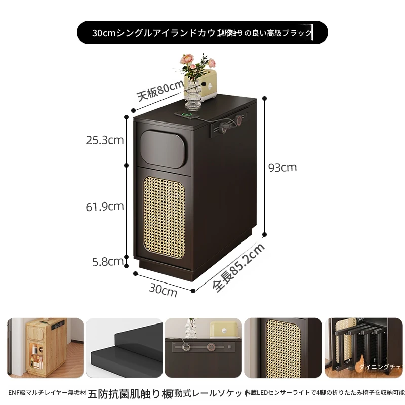 0.3メートルの狭い島台キャビネット【折りたたみ椅子4脚収納可+抗菌岩板天板+五つの防菌高級ブラック】