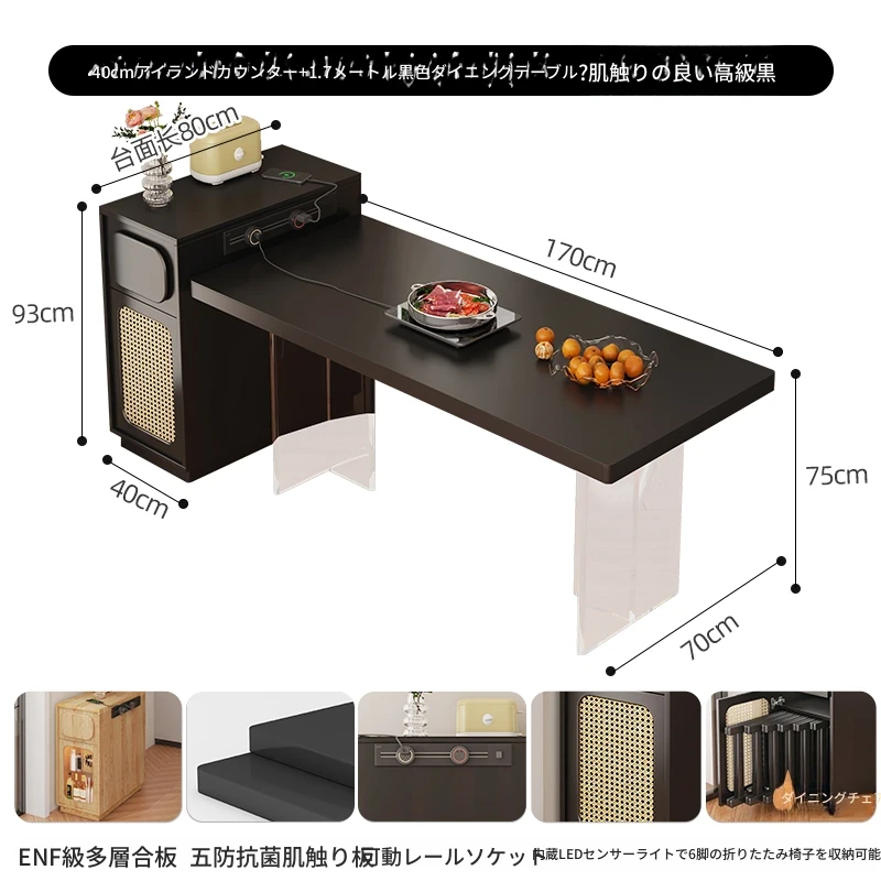 0.4メートルの狭い島台キャビネット+1.7メートルアクリルテーブル【折りたたみ椅子6脚収納可+抗菌岩板天板+五つの防菌高級ブラック】