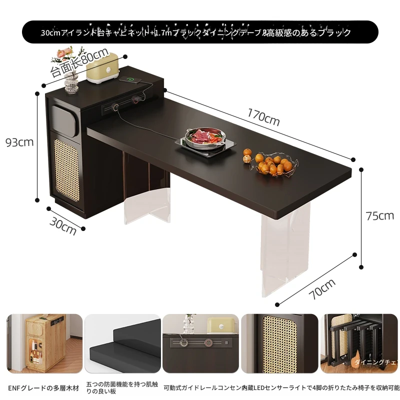 0.3メートルの狭い島台キャビネット+1.7メートルアクリルテーブル【折りたたみ椅子4脚収納可+抗菌岩板天板+五つの防菌高級ブラック】