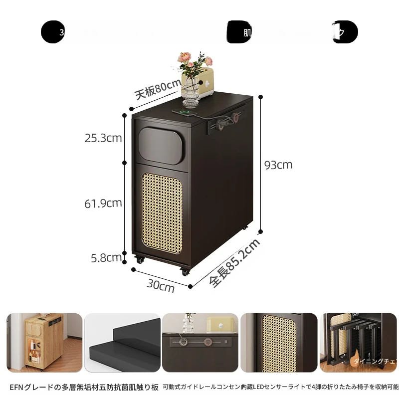 0.3メートルの狭い島台キャビネット+キャスター【折りたたみ椅子4脚収納可+抗菌岩板天板+五つの防菌高級ブラック】