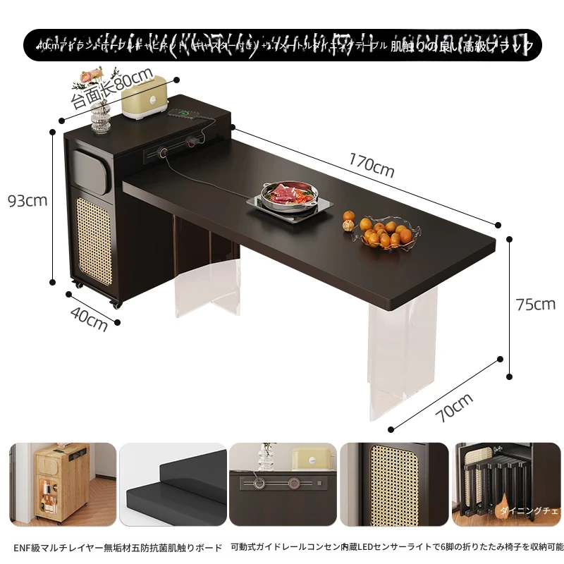 0.4メートルの狭い島台キャビネット+キャスター+1.7メートルアクリルテーブル【折りたたみ椅子6脚収納可+抗菌岩板天板+五つの防菌高級ブラック】