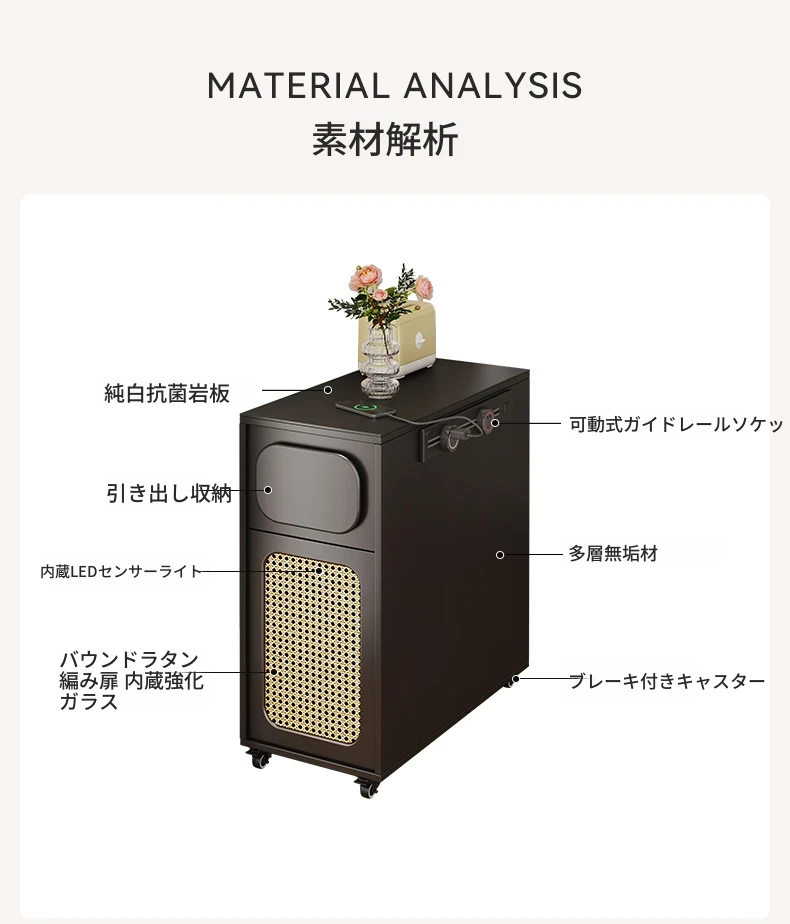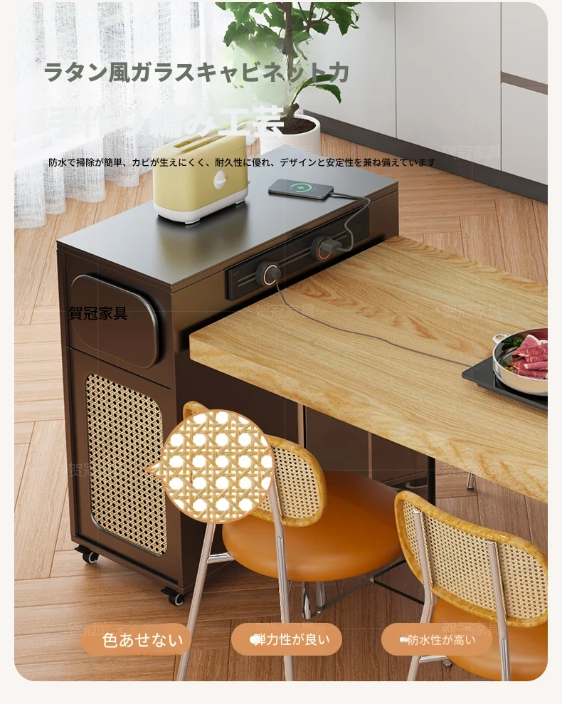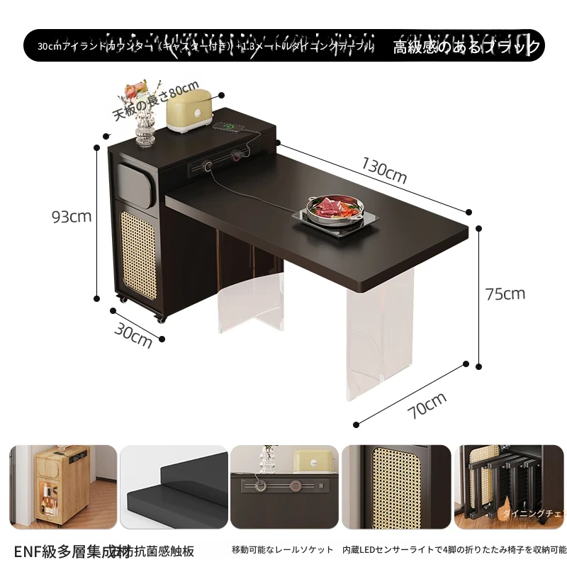 0.3メートルの狭い島台キャビネット+キャスター+1.3メートルアクリルテーブル【折りたたみ椅子4脚収納可+抗菌岩板天板+五つの防菌高級ブラック】
