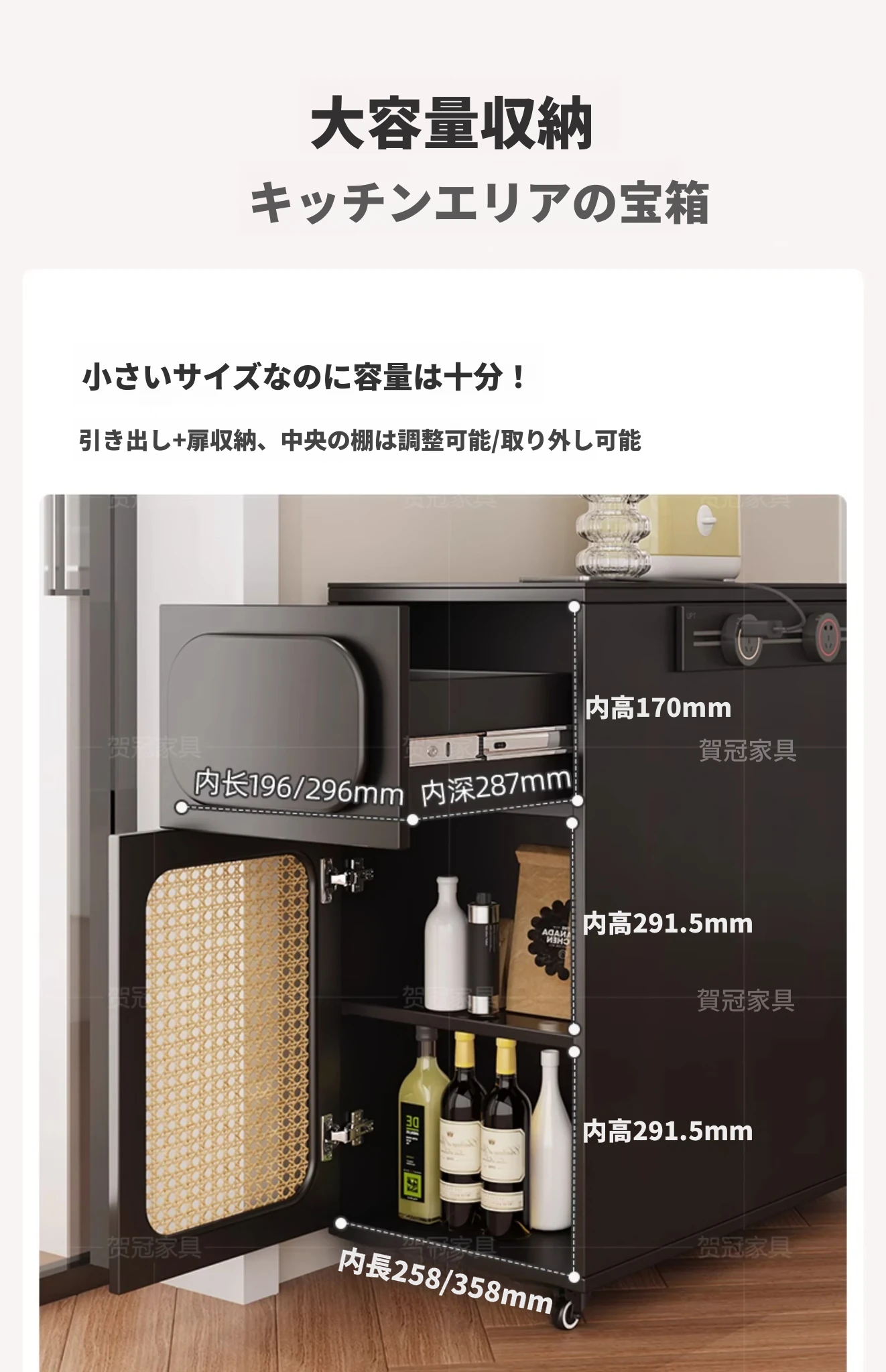 0.3メートルの狭い島台キャビネット+キャスター+1.7メートルアクリルテーブル【折りたたみ椅子4脚収納可+抗菌岩板天板+五つの防菌高級ブラック】