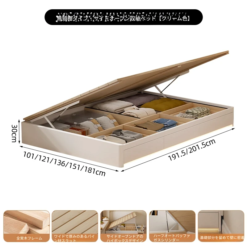 【クリーム色】薄型ヘッドボード付き-圧力式側開き収納ベッド