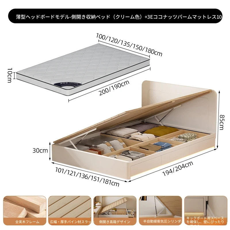 【クリーム色】薄型ヘッドボード付き-圧力式側開き収納ベッド+3Eココナッツファイバー10cmマットレス