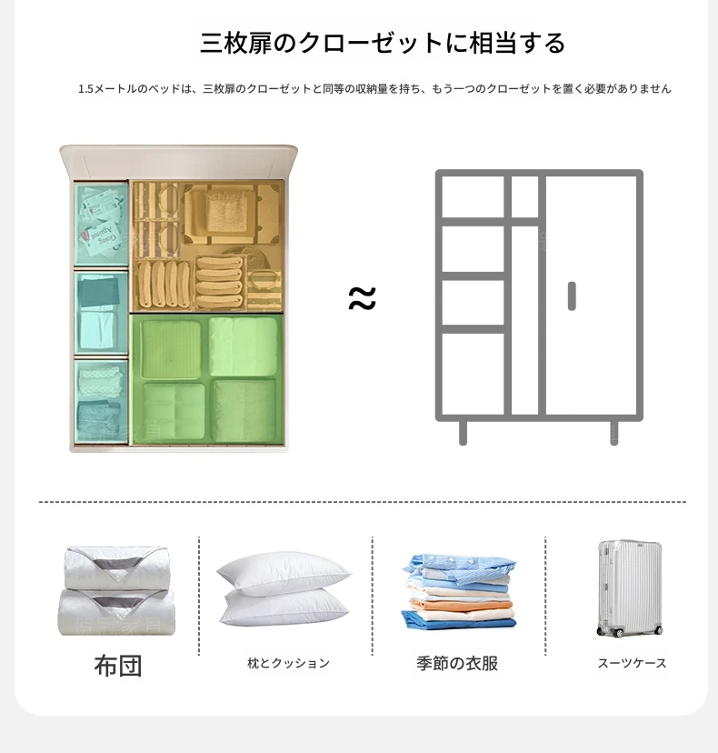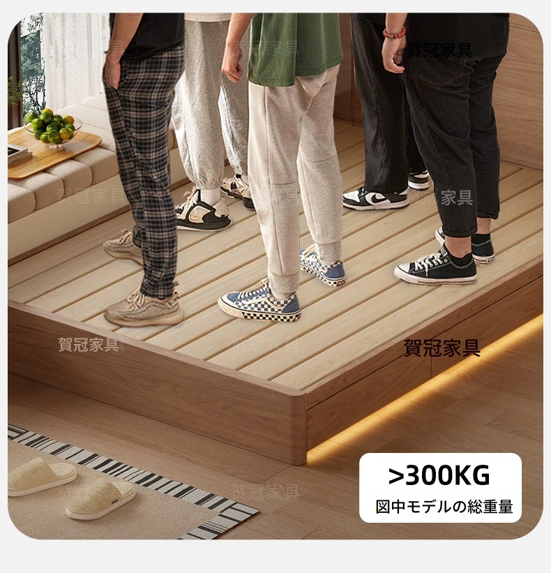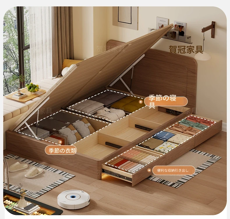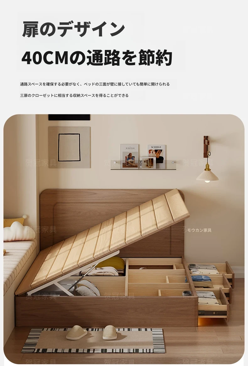 和風侘び寂びスタイルの無垢材ベッド|150cm防湿スラット&引き出し付きハイ収納ベッド|主寝室にぴったり!古き良きデザインでおしゃれ空間を演出!