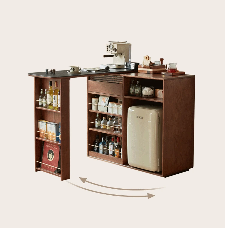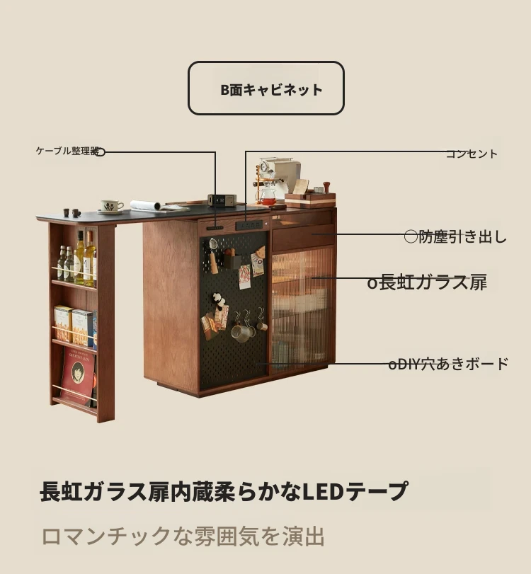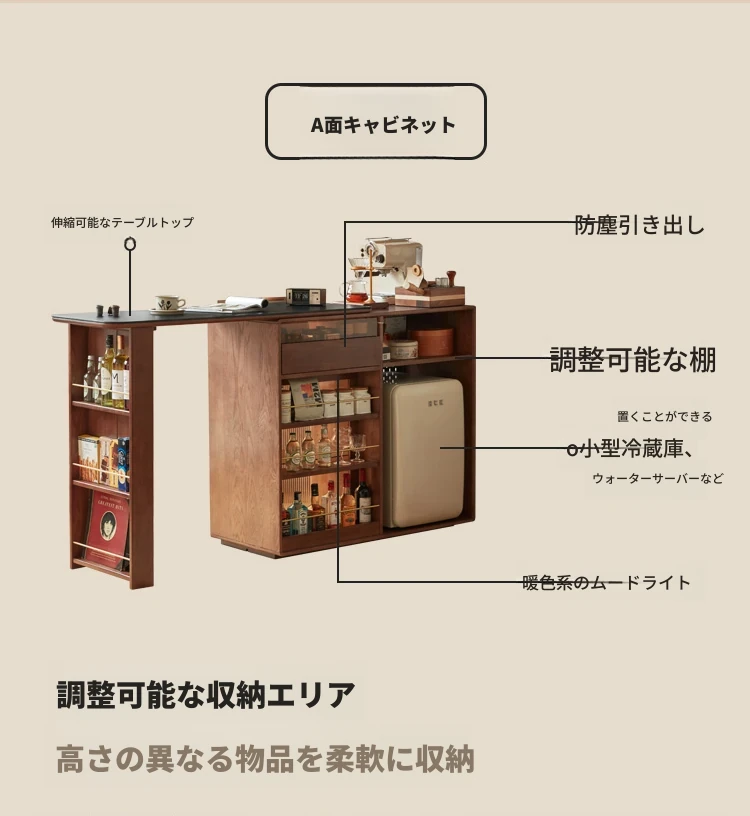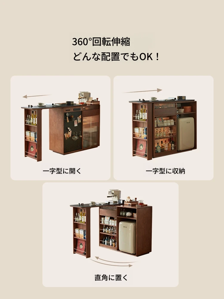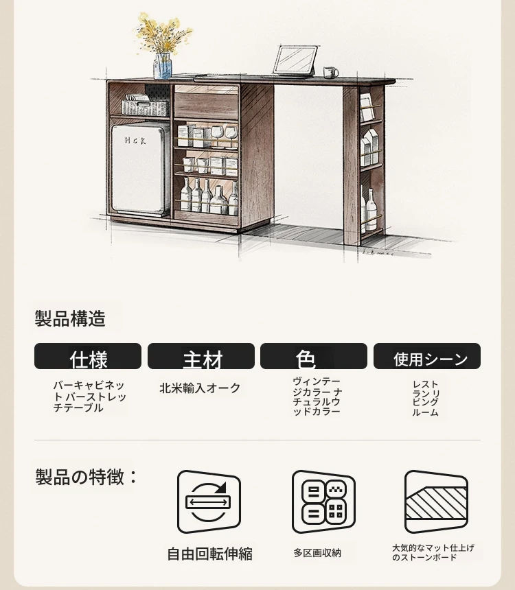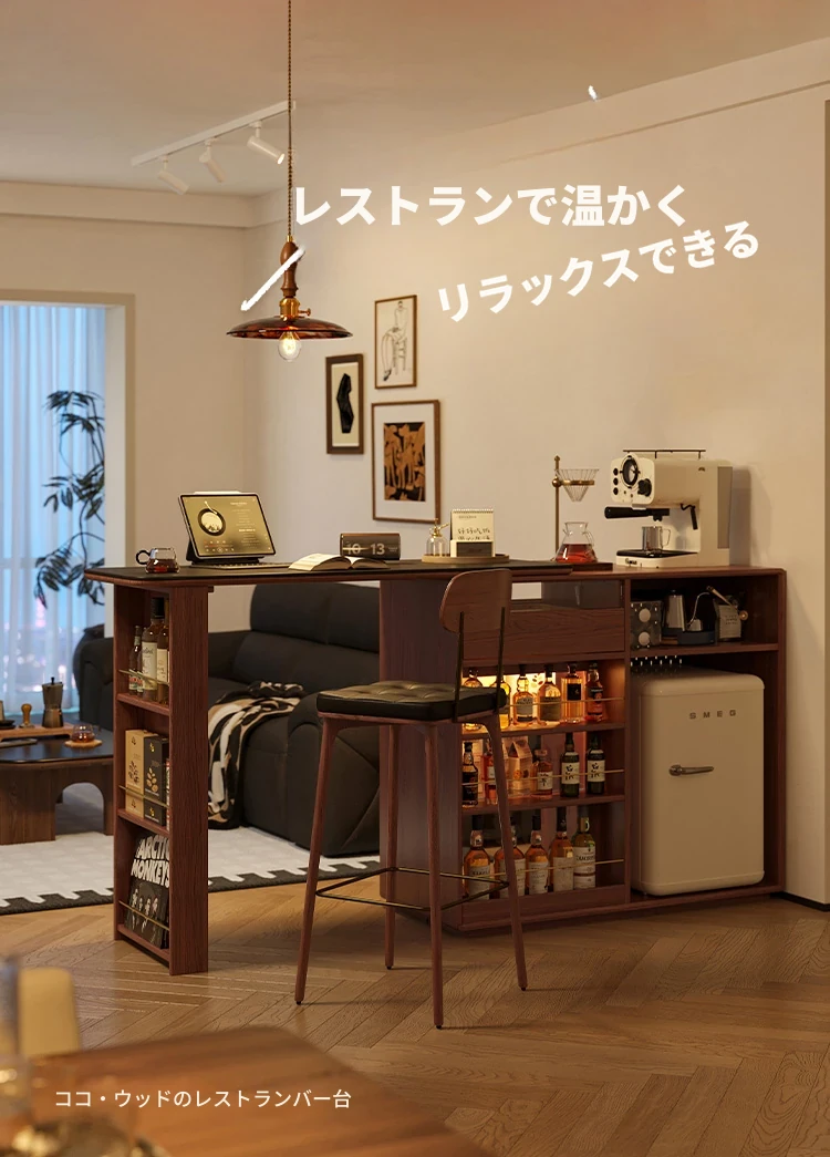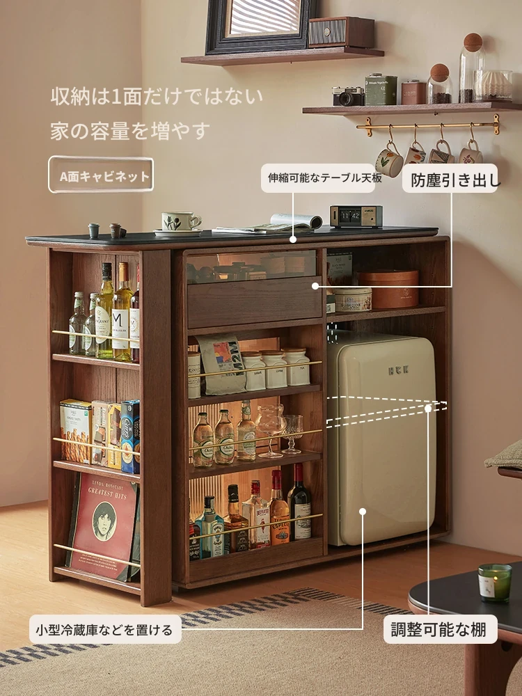 林氏家居の伸縮式無垢材バー台テーブル&ワインキャビネット一体型オーク収納キャビネット・仕切り収納・ココシリーズ。スタイリッシュなデザインで、お部屋をおしゃれに演出!