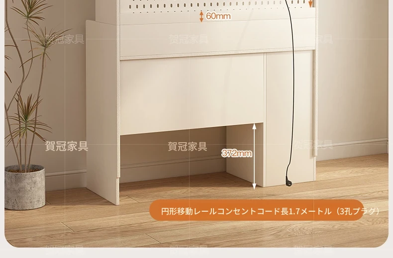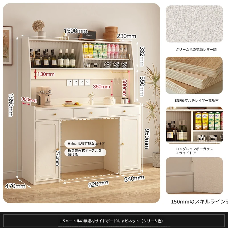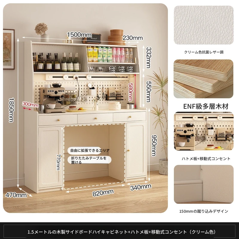 1.5メートル無垢材サイドボードハイボード+ディストレーションボード+モバイル電源タップ【五防抗菌肌感ホワイト】
