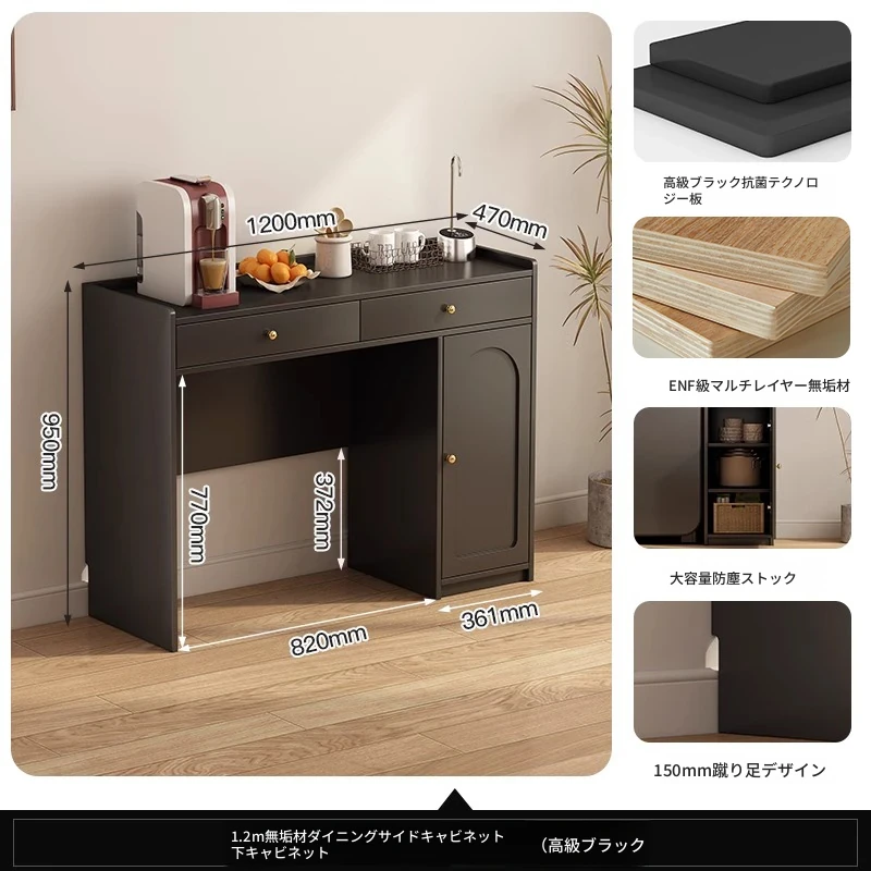 1.20メートル無垢材サイドボード下部【五防抗菌高級ブラック】