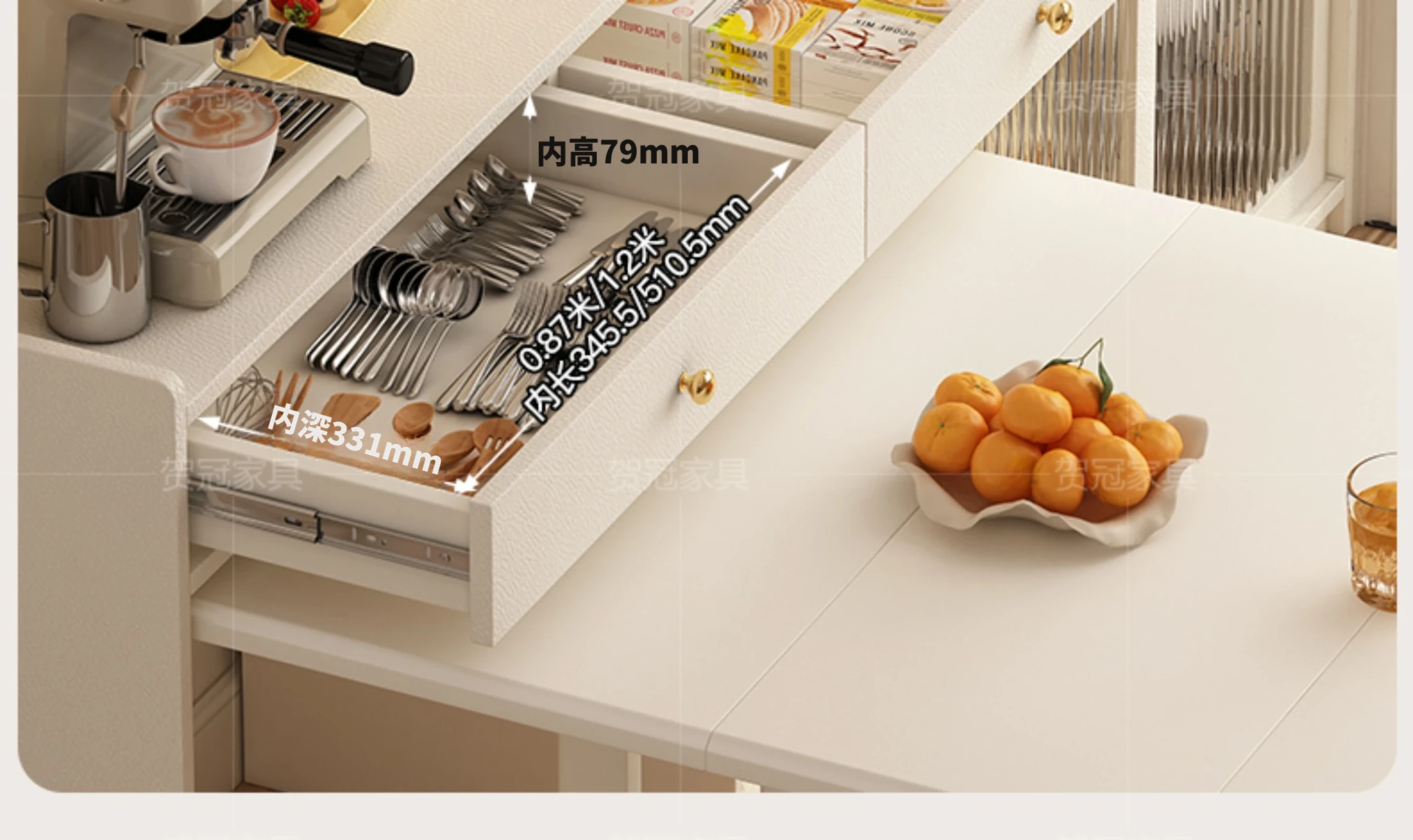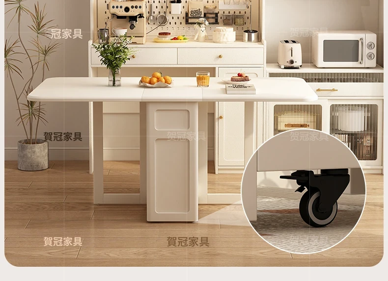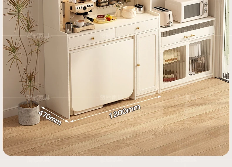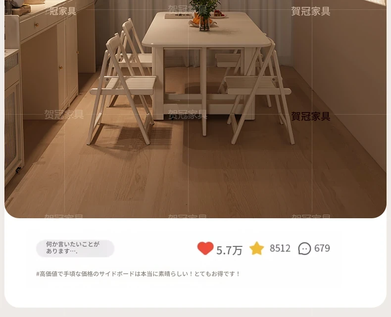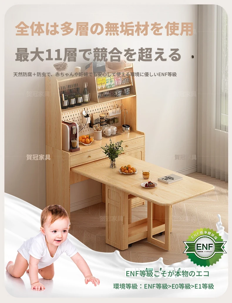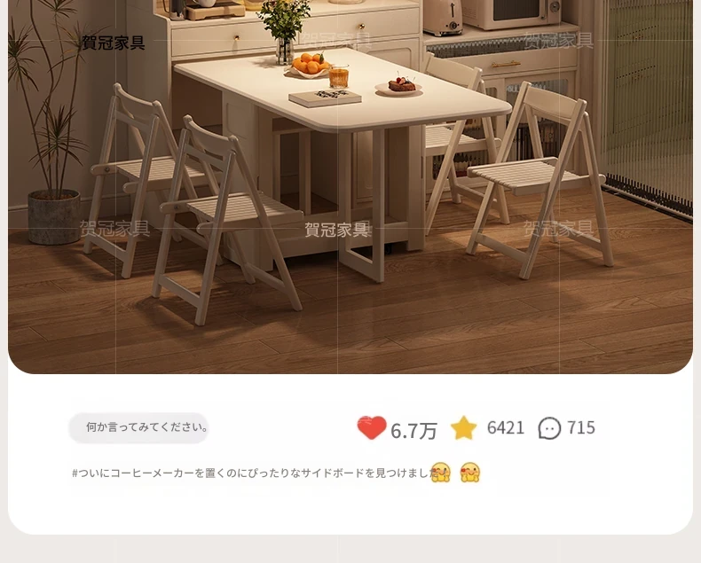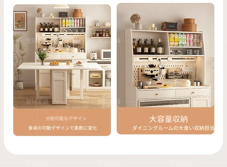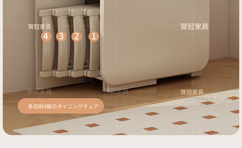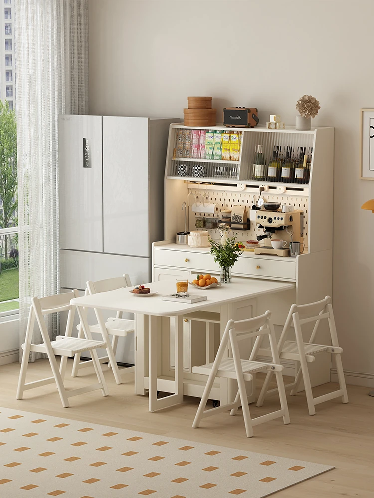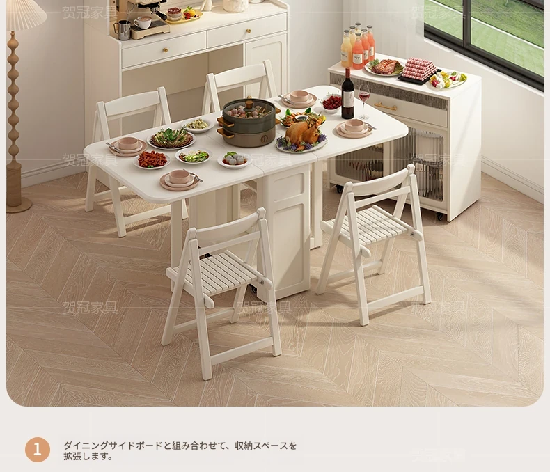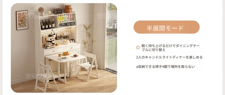 クリームカラーの食卓&サイドキャビネット一体型 2025年新作!モダンでシンプルなデザインのテーブル&4脚チェアのコンビネーション。小型住宅にもぴったりな折りたたみ式。おしゃれな空間を演出します!