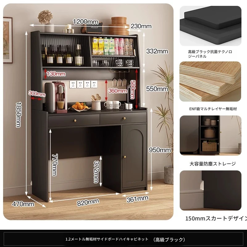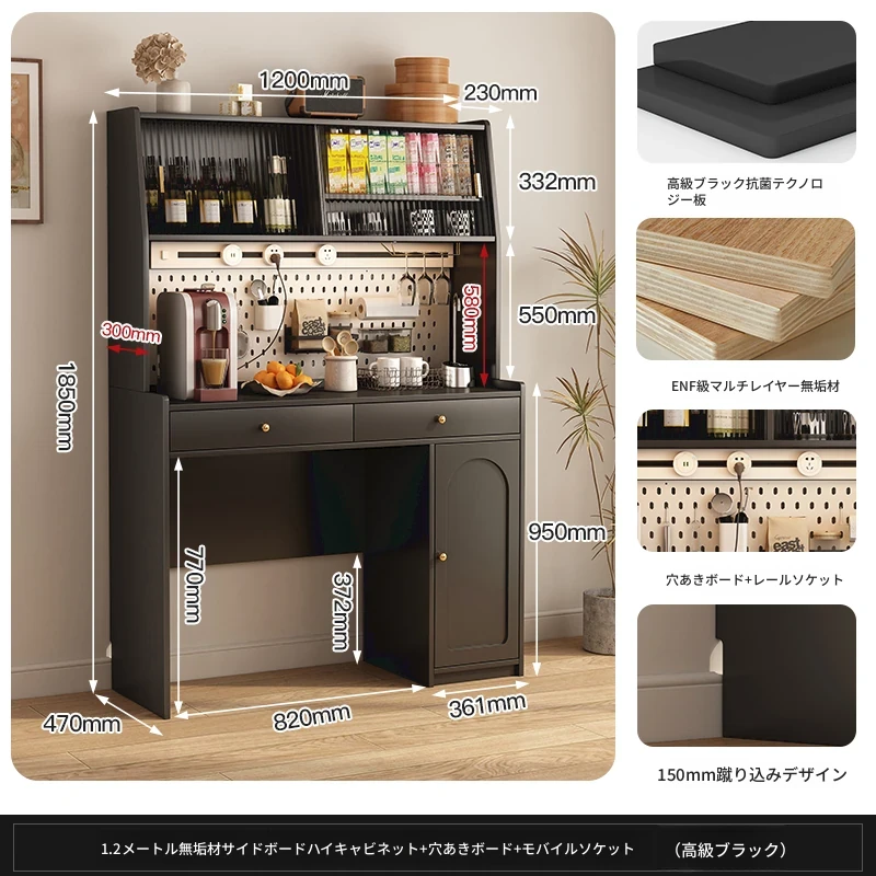1.2メートル無垢材サイドボードハイボード+ディストレーションボード+モバイル電源タップ【五防抗菌高級ブラック】