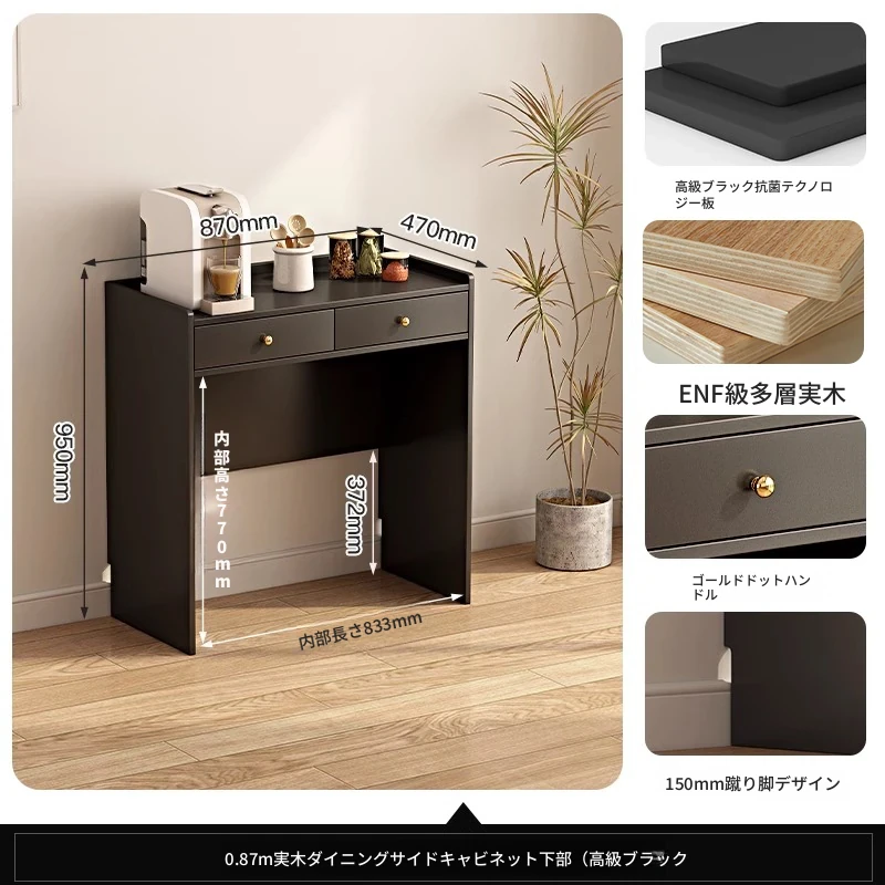 0.87メートル無垢材サイドボード下部【五防抗菌高級ブラック】