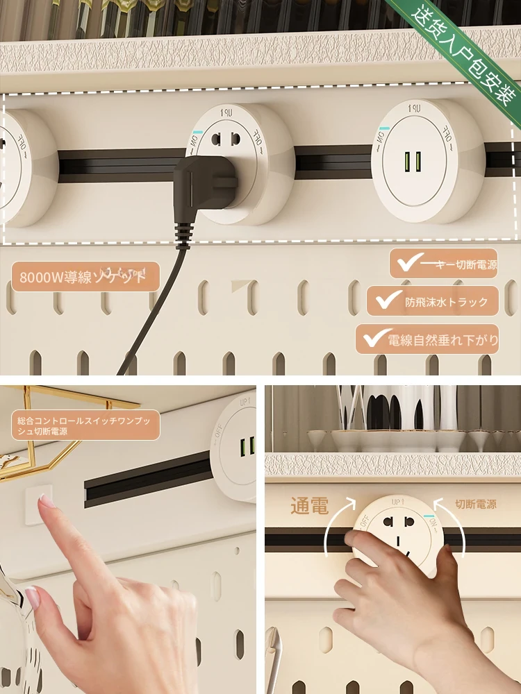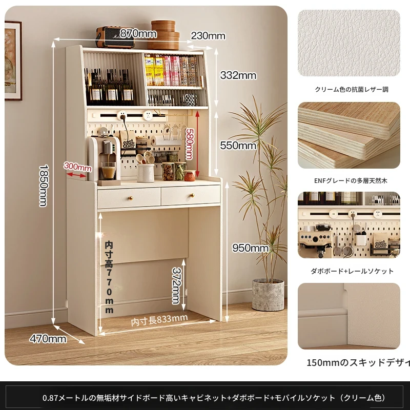 0.87メートル無垢材サイドボードハイボード+ディストレーションボード+モバイル電源タップ【五防抗菌肌感ホワイト】
