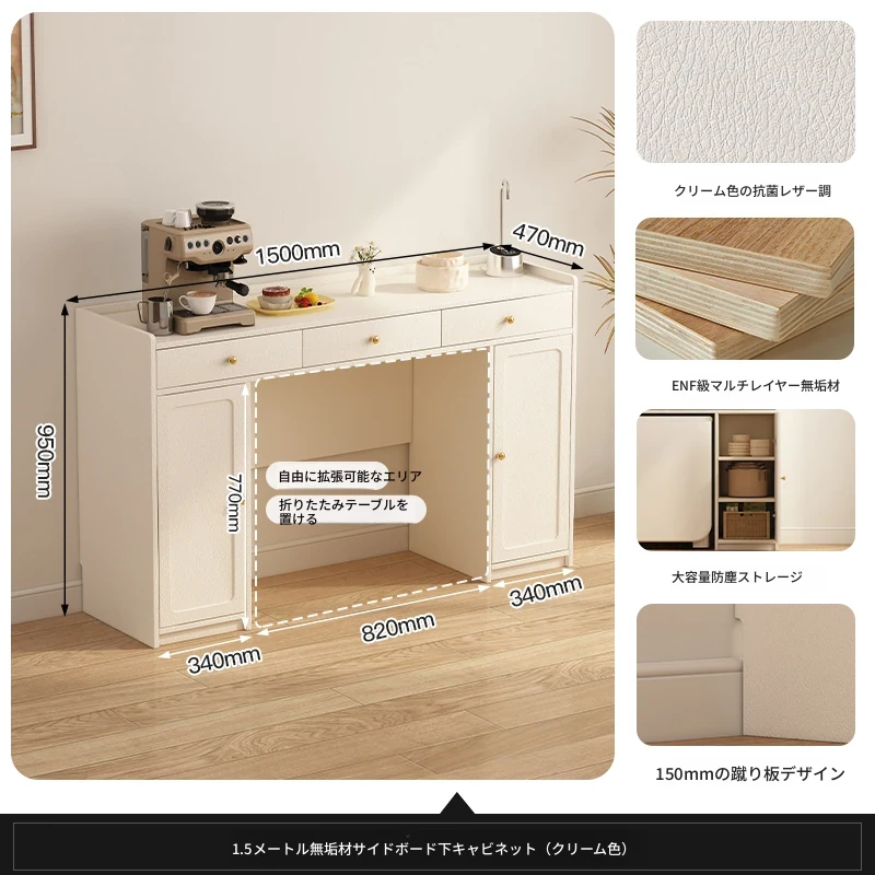 1.50メートル無垢材サイドボード下部【五防抗菌肌感ホワイト】