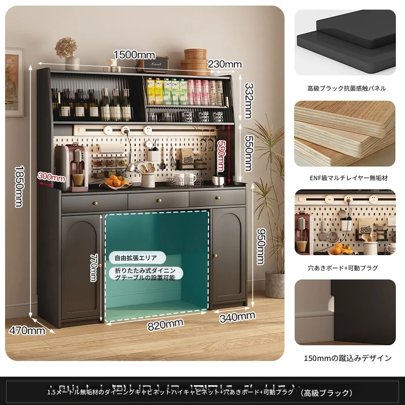 1.5メートル無垢材サイドボードハイボード+ディストレーションボード+モバイル電源タップ【五防抗菌高級ブラック】