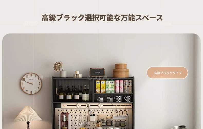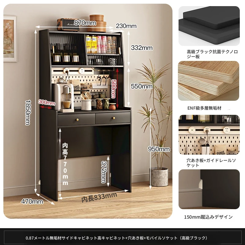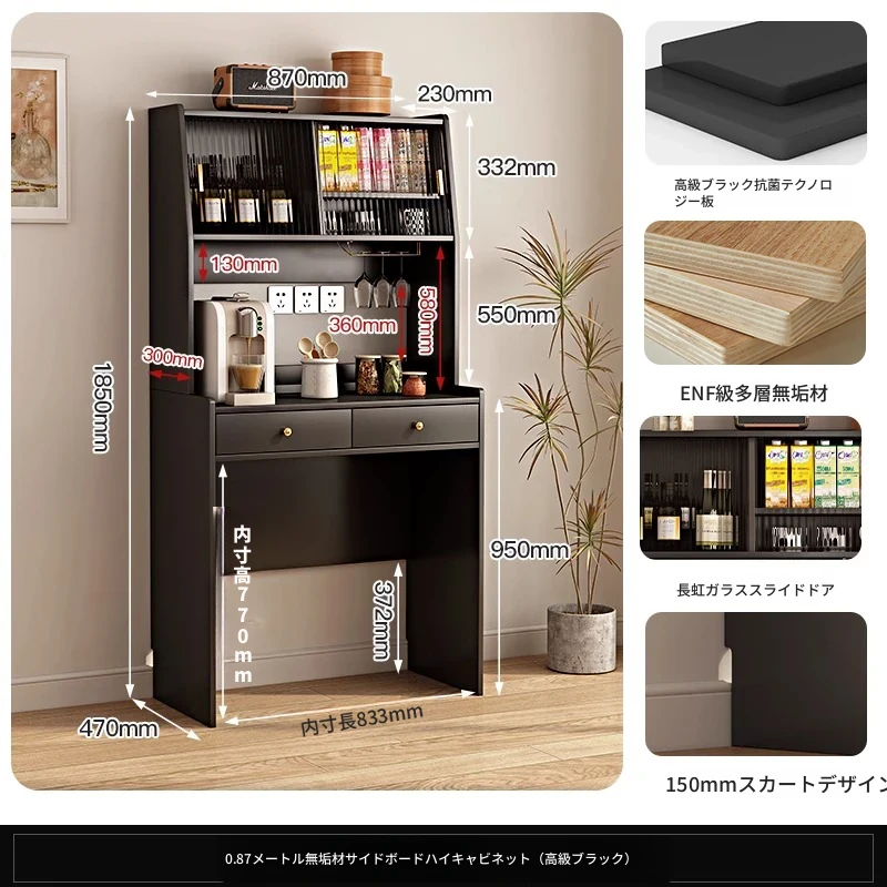 0.87メートル無垢材サイドボードハイボード+ディストレーションボード+モバイル電源タップ【五防抗菌高級ブラック】